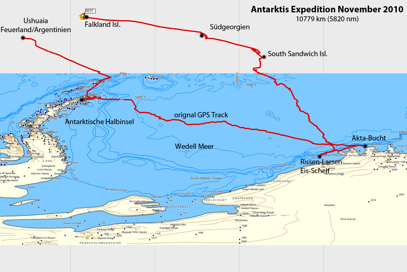 Das Expeditions-Schiff war der legendäre russische Eisbrecher Kapitan Khlebnikov der russischen Reederei FESCO, die auch den Rekord für den südlichsten je von einem Schiff erreichten Punkt hält (ca 78,7° Süd). Hier die Route im GPX-Format für Navis und im KML-Format für Google Earth sowie als Bild aus der Navi-Karte und aus Google Earth. Das Schiff hat ca. 60 Mann Besatzung und kann bis zu ca. 100 Personen aufnehmen. Es gibt einen Hangar für zwei alte russische Hubschrauber und zahlreiche Schlauchboote sowie 4 gekapselte Rettungsboote. Der Eisbrecher schafft in kontinuierlicher Fahrt gut einen Meter Festeis und mit Rammstößen über 3m dickes Alteis zu brechen, bei vorhandenen Brüchen und Rinnen auch mehr. Das habt er auch wirklich gebraucht - im antarktischem Frühjahr (November) ist das Packeis wirklich noch mächtig, vor allem in der Wedell-Meer.