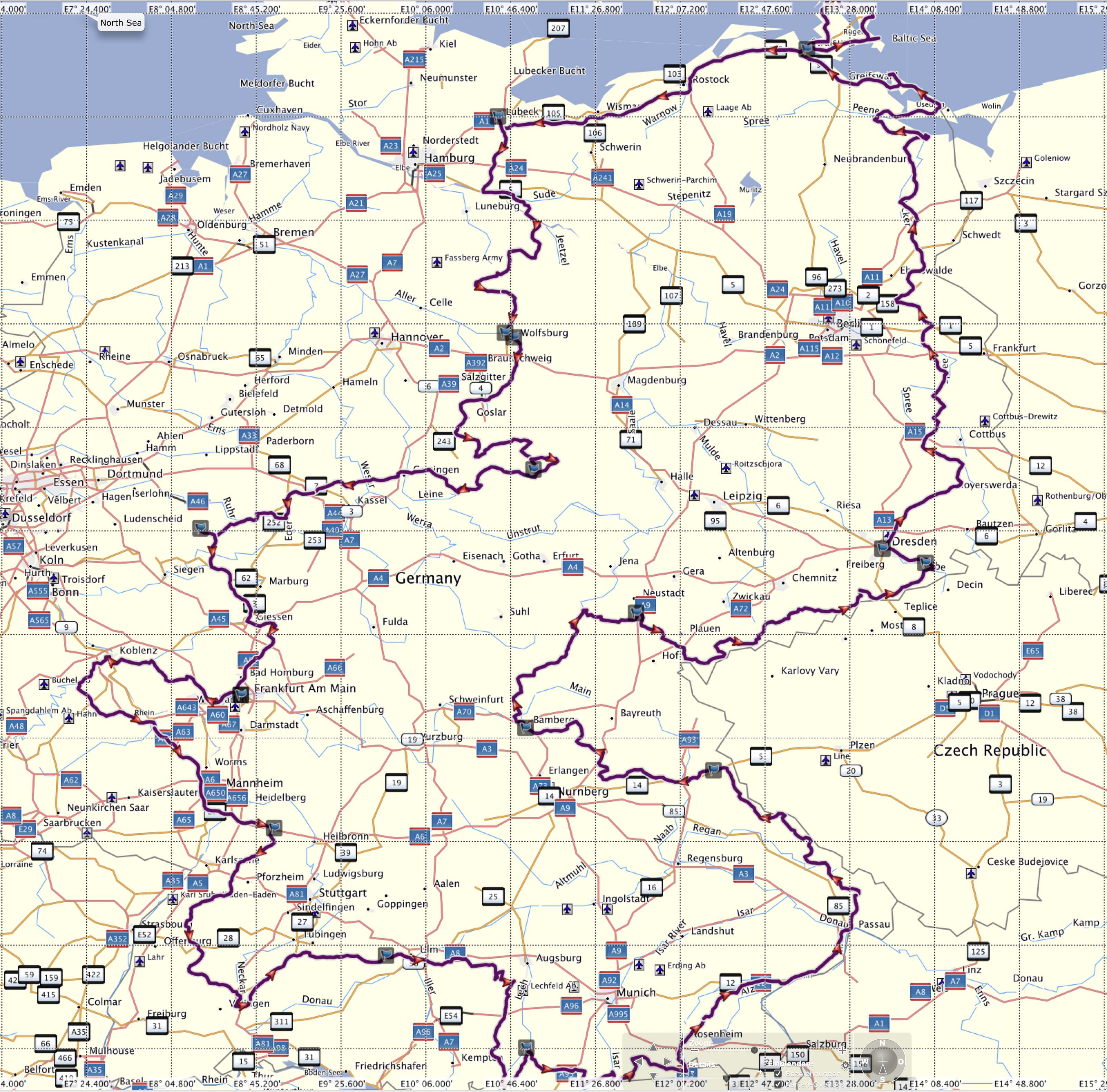 Hier die Route. Es ging von Freyung im südlichen Bayerwald in den Thüringer Wald, östlich von Berlin an die Ostseeküste mit Usedom und Rügen, Nach Lübeck, Wolfsburg mit Besichtigung des Volkswagenmuseums, durch den Harz, das Sauerland ans Deutscheck, wo die Mosel in den Rhein mündet, entlang der Mosel in den Schwarzwald, Besuch des Technikmuseum Sinsheim, durch Schwaben und Oberbayern bis zurück nach Freyung. Das Wetter war überwiegend okay, nur den ersten Tag und an der Mosel hat es geregnet. Es ist immer schön, die drei Jungs mit ihren Klassischen alten Boxer-BMWs zusammen zu sehen. Die gefahrene Strecke war laut Navi 4516km lang.