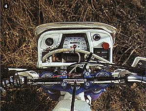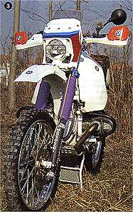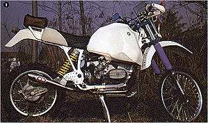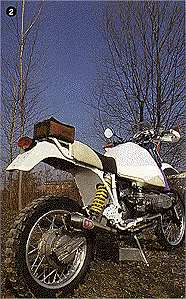 PICTURE 1: a short solo seat and a big 45 litres tank are typical features of this "stripped down" desert bike that, in spite of its majesty, seems to feel at ease on this kind of sandy soil. Starting from a quiet G/S 80, a carefully renovation has resulted in a highly efficient, specialized machine. |