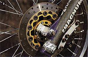 | PICTURE 4: The electrical system of this bike has been completely re-built. In addition to the tachometer, km counter and warning lights it has been configured to receive an electronic tripmaster and a satellite navigator (not shown here) . We notice the very strong execution of the brackets for the front fairing and the instrument panel. | PICTURE 5: The front fork is a multi-adjustable 45 mm Marzocchi Magnum 300 mm dumping; On the brake we can see a floating 260 mm disc by Brembo with a 4 pistons caliper , jointed with an ergal bracket. On the front wheel hub is the electronic trip master sensor and its magnet. |