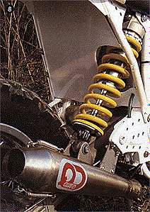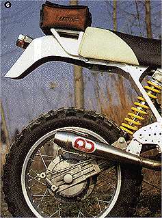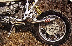 | PICTURE 6: simple and linear in design, the monolever swinging arm has been replaced by a new one more suitable for the hardest use. The rear drum brake is the standard one. | PICTURE 7: The rear wheel has been displaced by 14 mm to allow the mounting of a wider tire. |