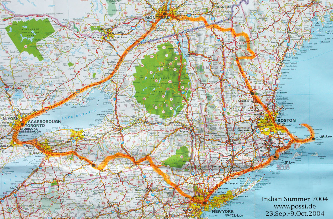 Eine kleine Rundtour, ausgehend von New York City (hier hatte ich mir meine Augen bei einem befreundeten Arzt Laser-operieren lassen), durch New Haven/Conneticut, Newport/Rhode Island, Cape Cod und Boston/Massachusetts, Plymouth, Withe Mountains SP/New England, Canada/Ontario, Montreal, Toronto/Lake Ontario, Niagara-on-the-lake, Niagara Falls, Finger Lakes/USA, Delaware/Pennsylvania, Newmark/New Jersey und Zurück nach NYC. Es war gerade Anfang Herbst, die Ahornwälder färbten sich wunderbar (siehe Fotos). Ein Besuch bei alten Freunden führte schließlich noch nach Toronto. Von Toronto und Montreal war ich nicht so begeistert, kein Vergleich mit NYC. Hier eine Karte der Route.