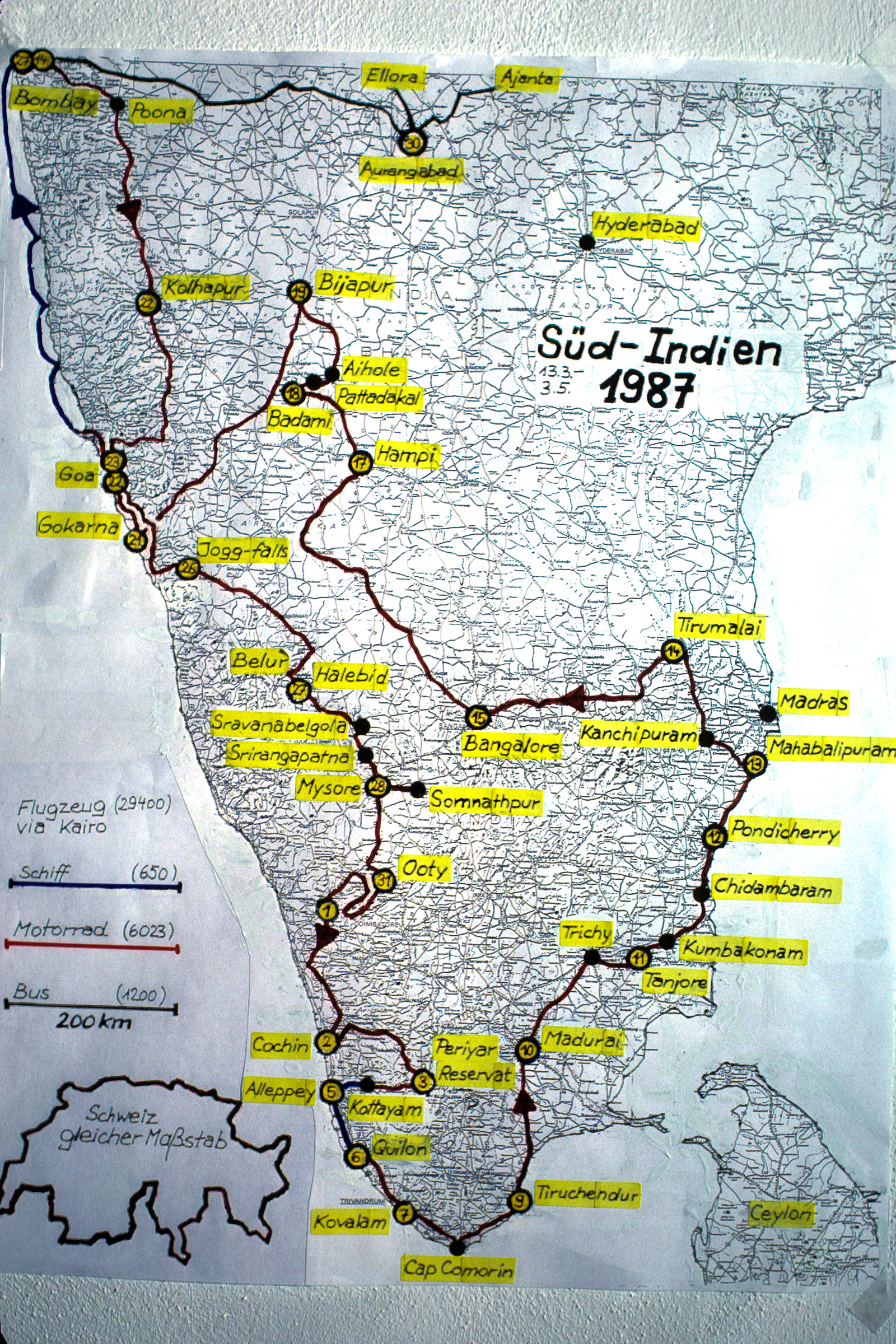 Indisches Essen ist gewöhnungsbedürftig. Man gehe möglichst immer in das beste Hotel, zumindest in kleineren Orten (öbernachtungskosten eine bis zwanzig Mark pro Doppelzimmer). Unterkunft zu finden war dank des Motorrads stets problemlos. Zelten oder selbst kochen halte ich in Indien nicht für zweckmäßig.