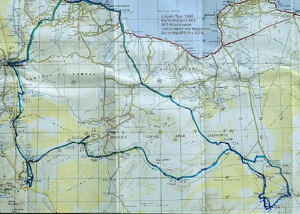 Führer zur Verfügung hatten. Mit Kompass, Karte und GPS sollte man umgehen können, dazu muß man ein Auge für das Gelände entwickeln, denn Navigation ist eine praktische Disziplin. Technische Navigationshilfen können ausfallen. Für die libysche Sahara gibt es leider nicht so schönes Karten-Material wie für Algerien, als Übersicht dient natürlich die Karte Michelin 953, dazu die Geo Projekts Karte Libyen (die Propaganda-Grenzverläufe der Militärregierung zeigt, die nicht der Praxis entsprechen). Daneben gibt es noch russische Militärkarten (mit kyrillischer Beschriftung) mit gutem Masstab sowie die bekannten amerikanischen Fliegerkarten, die aber kaum Pisten zeigen. Nicht mehr aufzutreiben sind hochmaßstäbige italienische Karten aus den vierziger Jahren, von denen ich nur einige Fotos kenne, die einzigen Karten, wo einige der Mandara-Seen verzeichnet sind. Wer Geduld hat, findet hier einen Scan der Michelin-Karte von Libyen mit unserer Reise eingezeichnet (198 Kbyte-JPG, hochauflösend).
