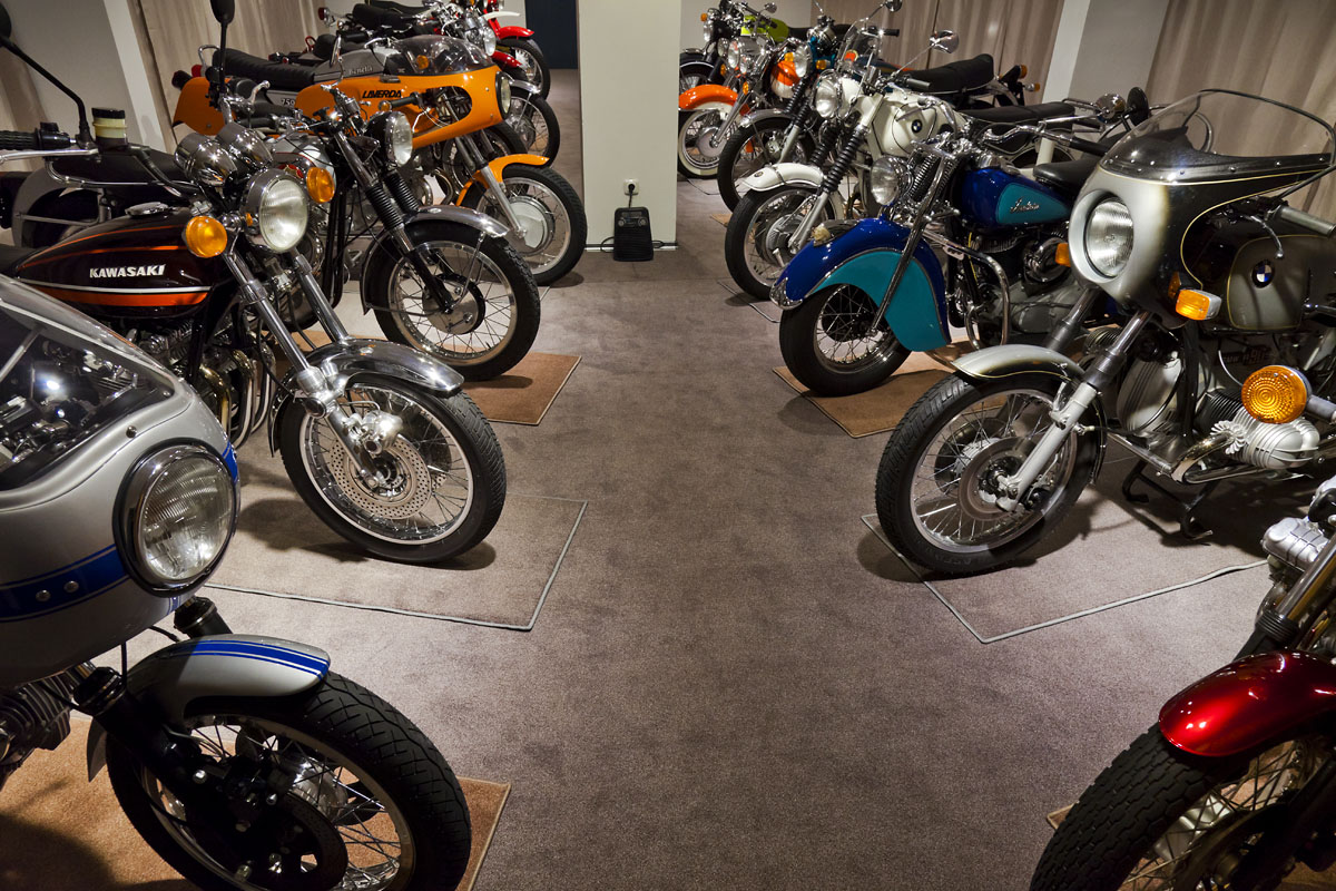 Der ultimative Italo-Klassiker Anfang der 70er, eine richtige Ikone. Die schrille und einmalige Farbgebung unterstreicht den supersportlichen Anspruch, die der gedrosselte Vierzylinder-Rennmotor und der Kardanantrieb nicht ganz einlösen konnte. Die im Prospekt versprochenen 225 km/h erreichte das gute Stück bei weitem nicht. Diese Maschine war das teurste Motorrad seiner Zeit (teurer als die Münch Mammut). Lange hatte sich Graf Agusta gewehrt, die Technologie der zahlreichen Rennerfolge von MV in ein käufliches Motorrad hineinzustecken. Er wollte verhindern, daß Privatfahrer daraus eine richtige Rennmaschine bauen. Vielleicht ist das auch der Grund für den Kardan, der sonst zum sportlichen Anspruch nicht recht harmoniert. Der Motor mit seinen zahlreichen Zahnrädern und Lagern sowie den ziemlich offenen Vergasern und Auspuffrohren bläst eine recht feurige Musik, kaum zu glauben, daß sowas mal erlaubt war. Diese 1972er MV Agusta wurde vom Importeur Hansen nach Deutschland gebracht und war von Anfang an in Liebhaberhänden. Sie hat Original nur gut 5000 km drauf und musste nie restauriert werden. Mit viel Glück habe ich sie 2011 von einem MV Sammler erhalten können, der sie doppelt hatte. Originalzustand.