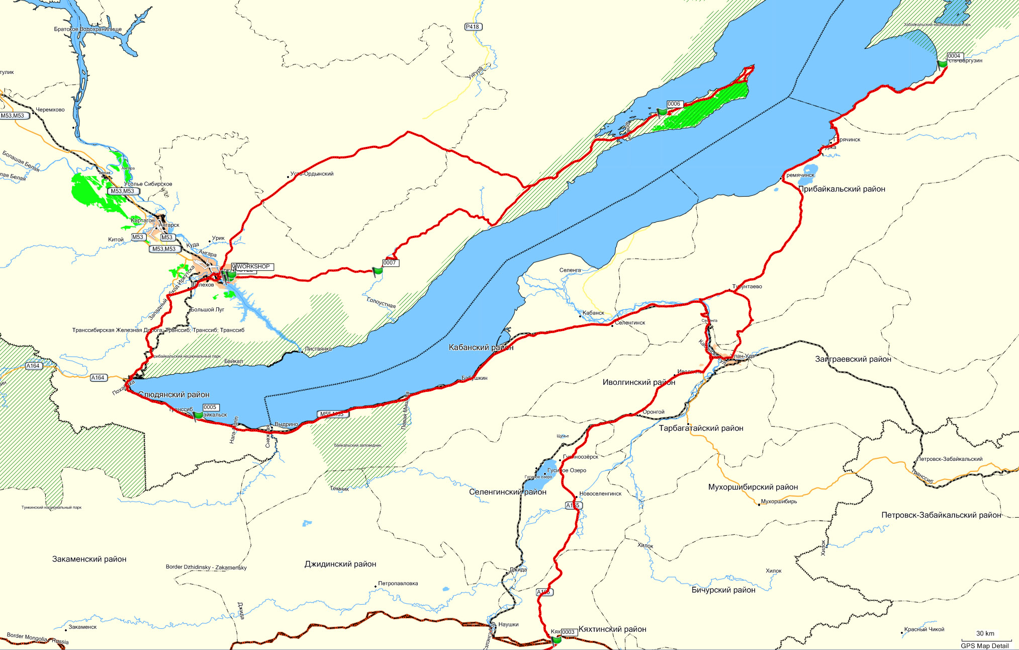 Wir überquerten also von Süden kommend die Grenze nach Sibirien, wobei der Papierkram etwa 2 Stunden dauerte. Am Vorabend unseres Visumbeginns hatte man uns aber wegen 4 Stunden "zu früh" nicht mehr über die Grenze gelassen (was eigentlich auch zu erwarten war). Von dort ging es dann zunächst nach Ulan Ude, dann weiter entlang des Ostufers der Baikalsees über Erdpisten nach Ust-Barguzin. Dann zurück nach Süden am Ufer und über Baykalsk nach Irkutsk, der größten Stadt der Region. Weiter setzten wir über es auf die Insel Olkhon, die sehr malerisch ist. Man findet hier Hütten oder kann zelten. Es war angenehm warm, oft über 20 Grad. Die landschaftlich imposante Nordpitze der Insel ist nur über Tiefsandpisten zu erreichen.